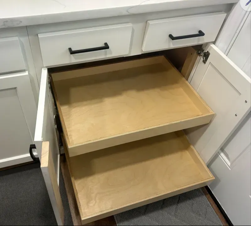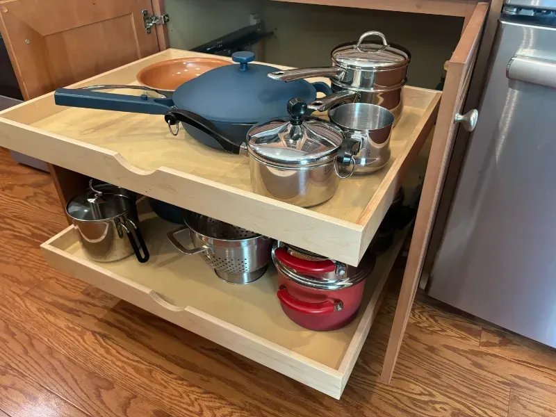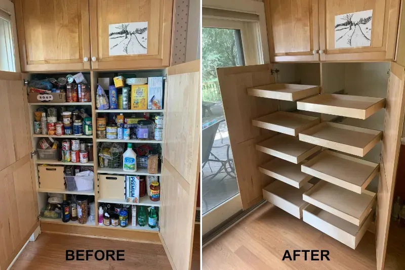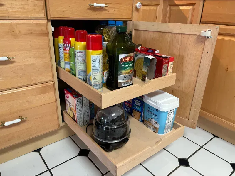 Our custom system replaces fixed shelves with easy glide-out storage, providing easier access to your cabinets and more room to store your goods within the same space.